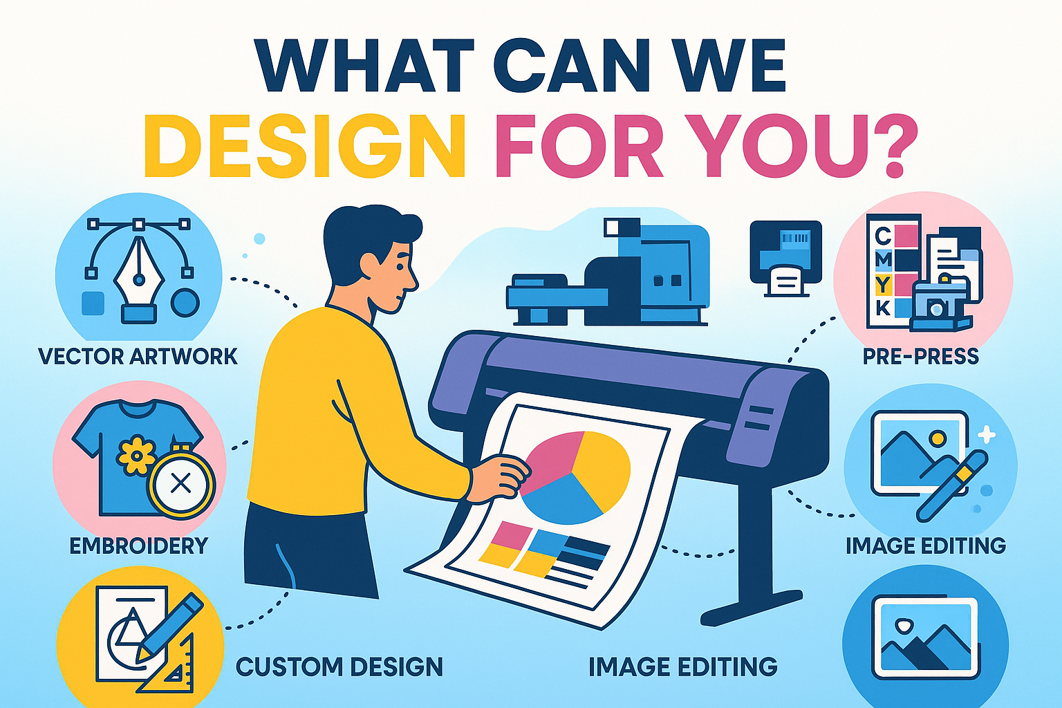 We bring your ideas to life through creative and impactful design. Our Custom Design services help transform your vision into visuals that leave a lasting impression—whether you need a compelling brand identity, a high-impact marketing campaign, or any other creative project. From distinctive logos and professional stationery to striking posters, brochures, banners, and digital graphics, our talented team delivers designs that connect with your audience. We believe great design is the backbone of effective marketing. That’s why our designers combine creativity, technical precision, and brand insight to deliver exceptional results—quickly, efficiently, and with maximum impact.